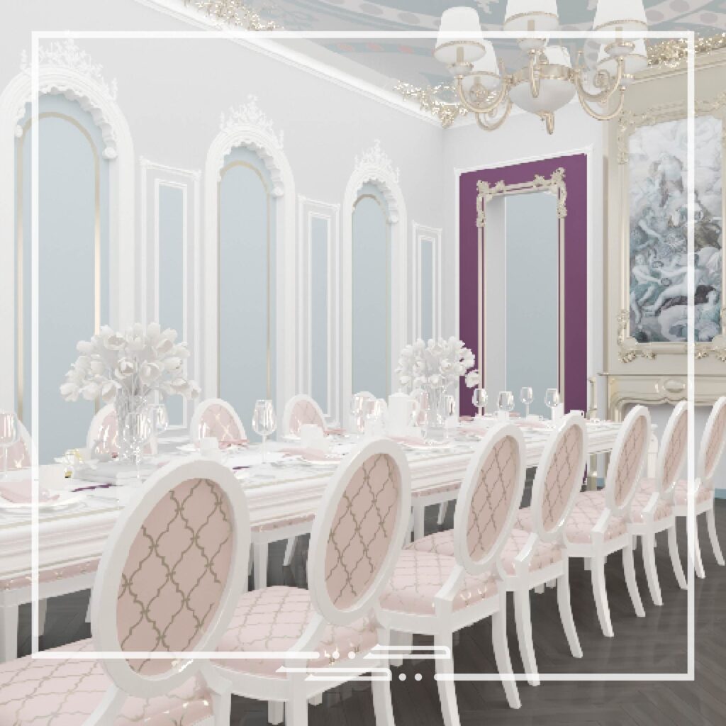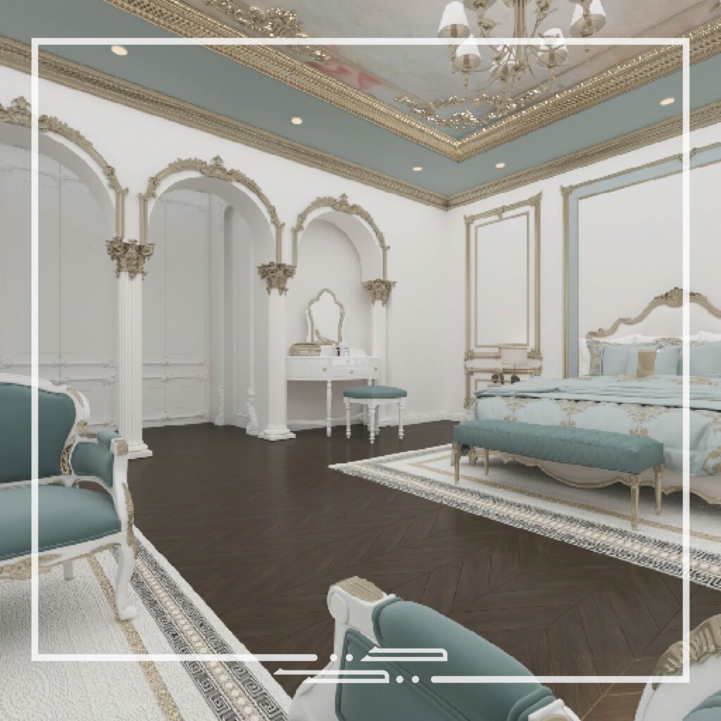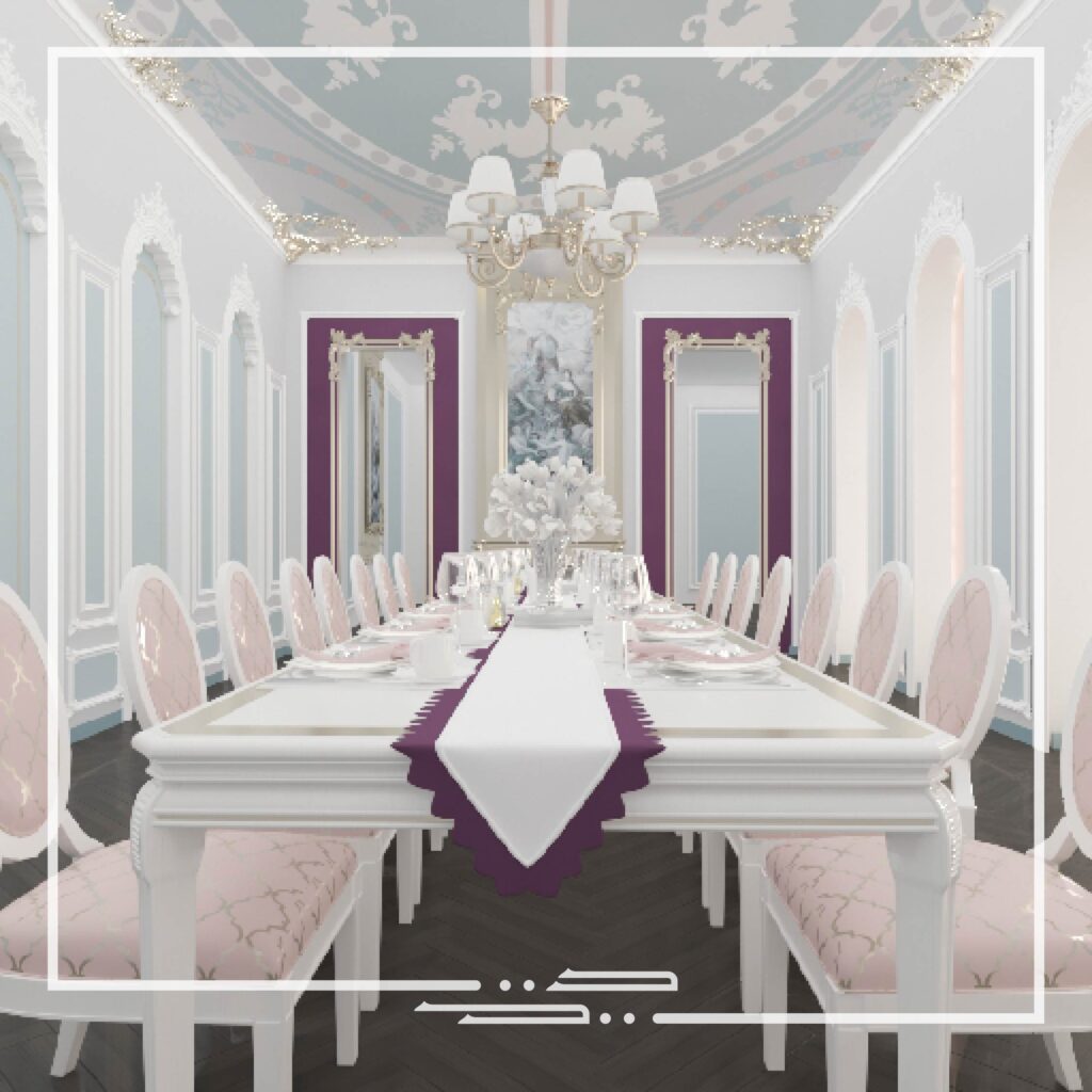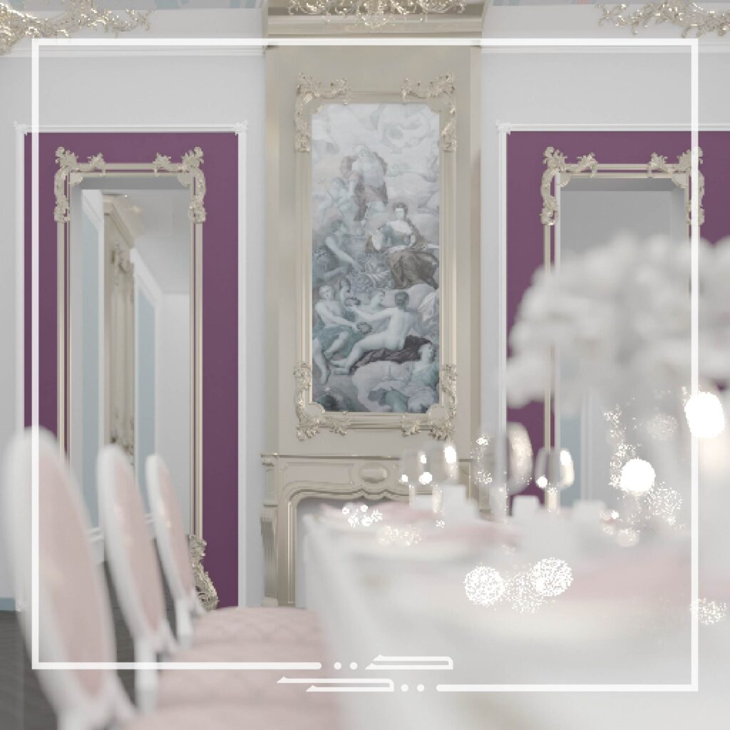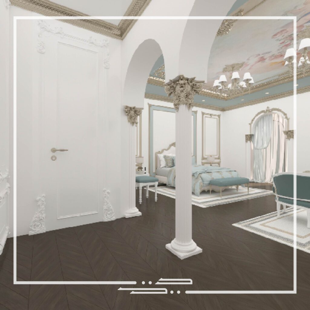This interior was inspired by palatial style interiors, which differs from the conventional classic style in the aspect of the different colors that are used and the excessive small patterns and details on the walls and ceilings.