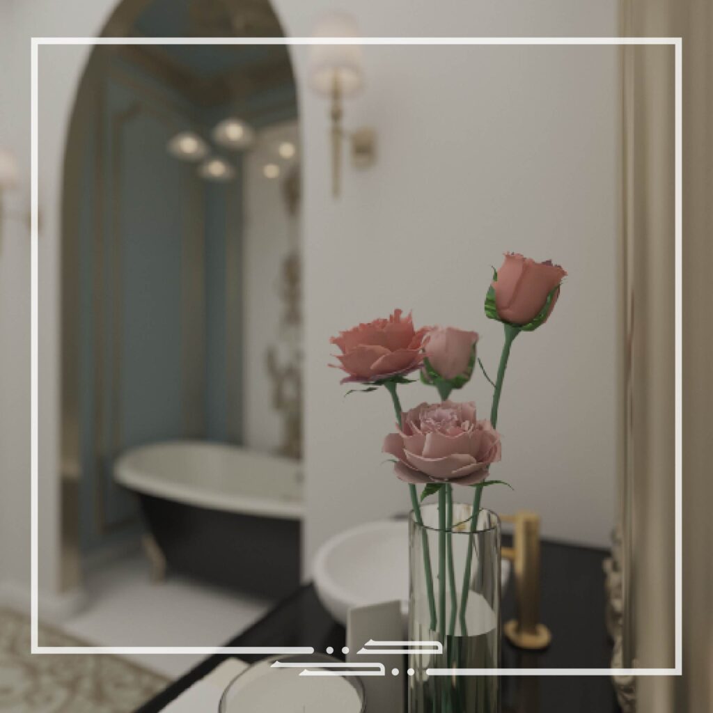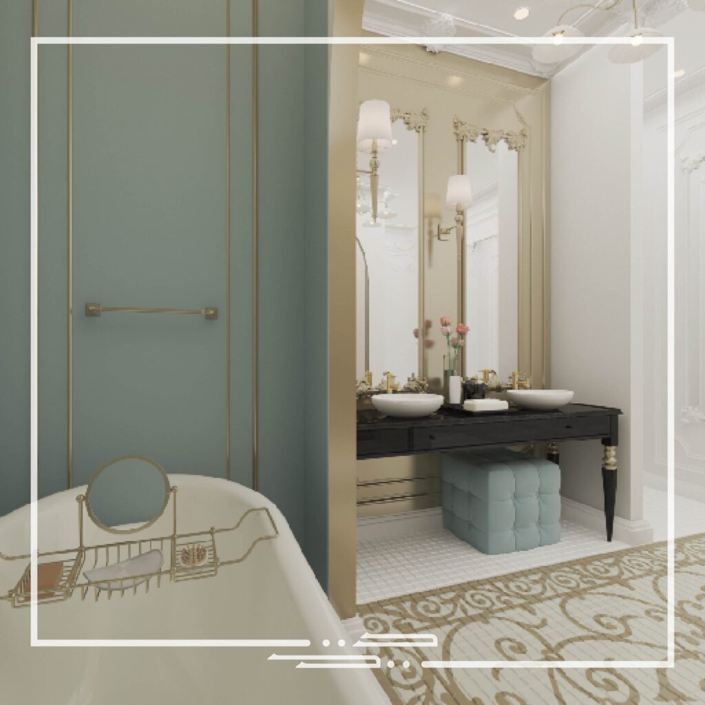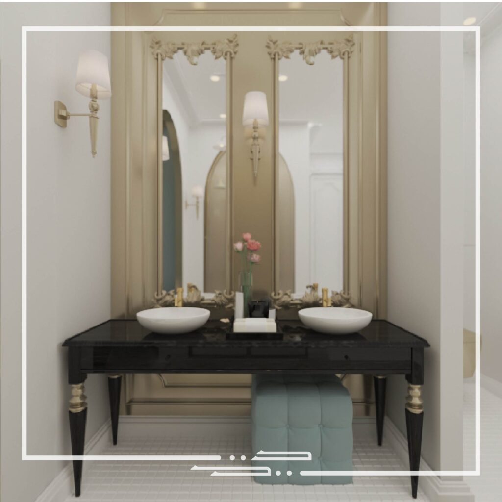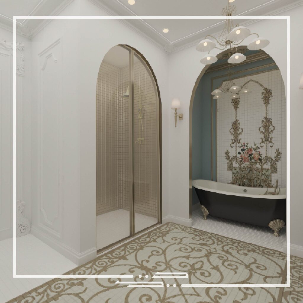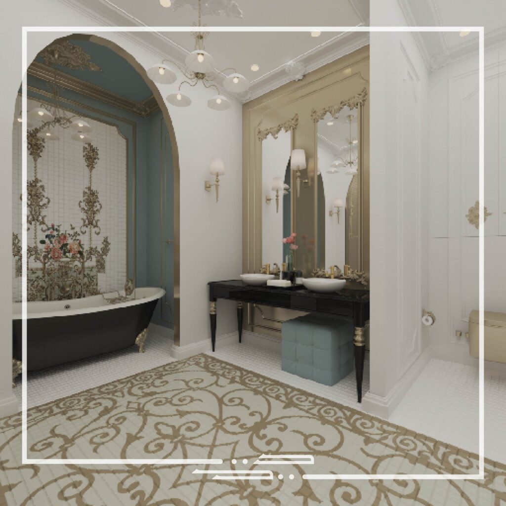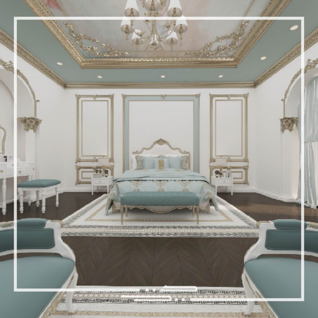This interior was inspired by palatial style interiors, which differs from the conventional classic style in the aspect of the different colors that are used and the excessive small patterns and details on the walls and ceilings.
