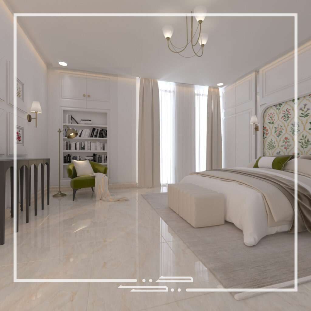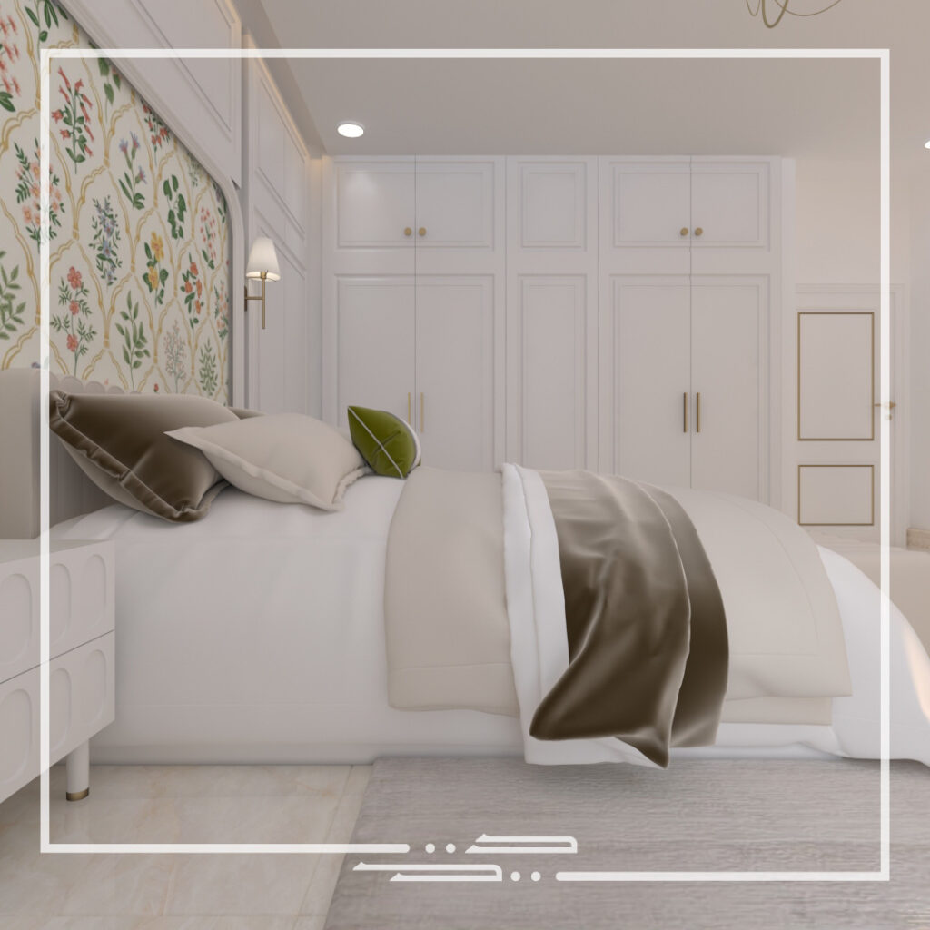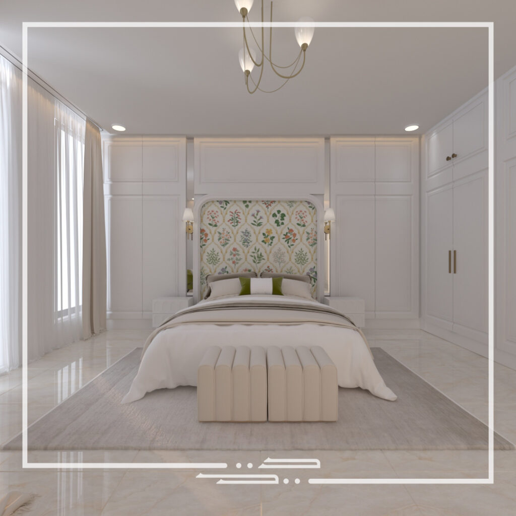 Designed interior of a bedroom, the classic style is used to compliment the style of the house.